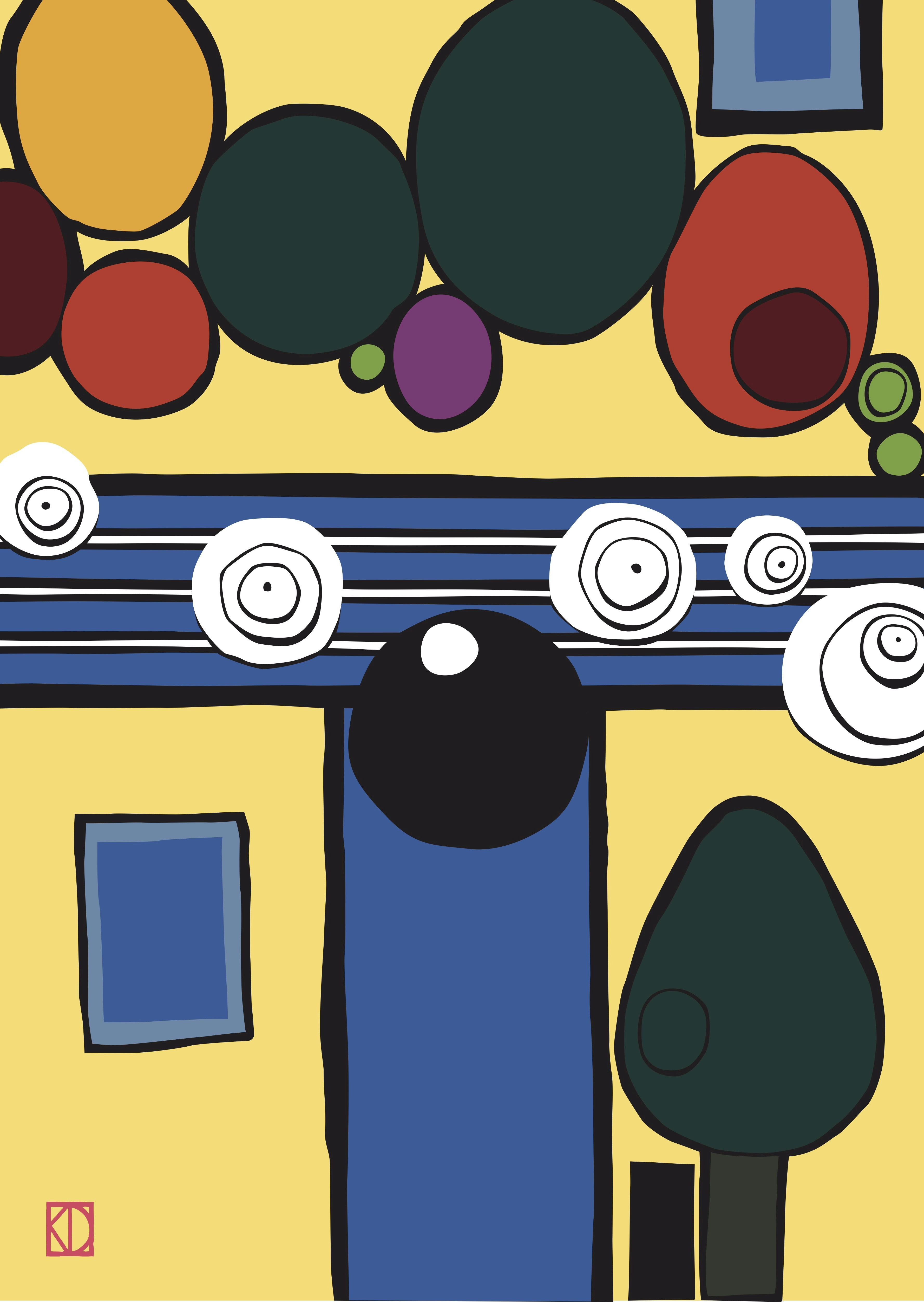 Portobello Road for Memo, Paris. The bottle depicts an arial view of the artist’s studio with the motorway above, trees and railway line opposite, and the artist herself looking for the keys represented by the black dot by the door.