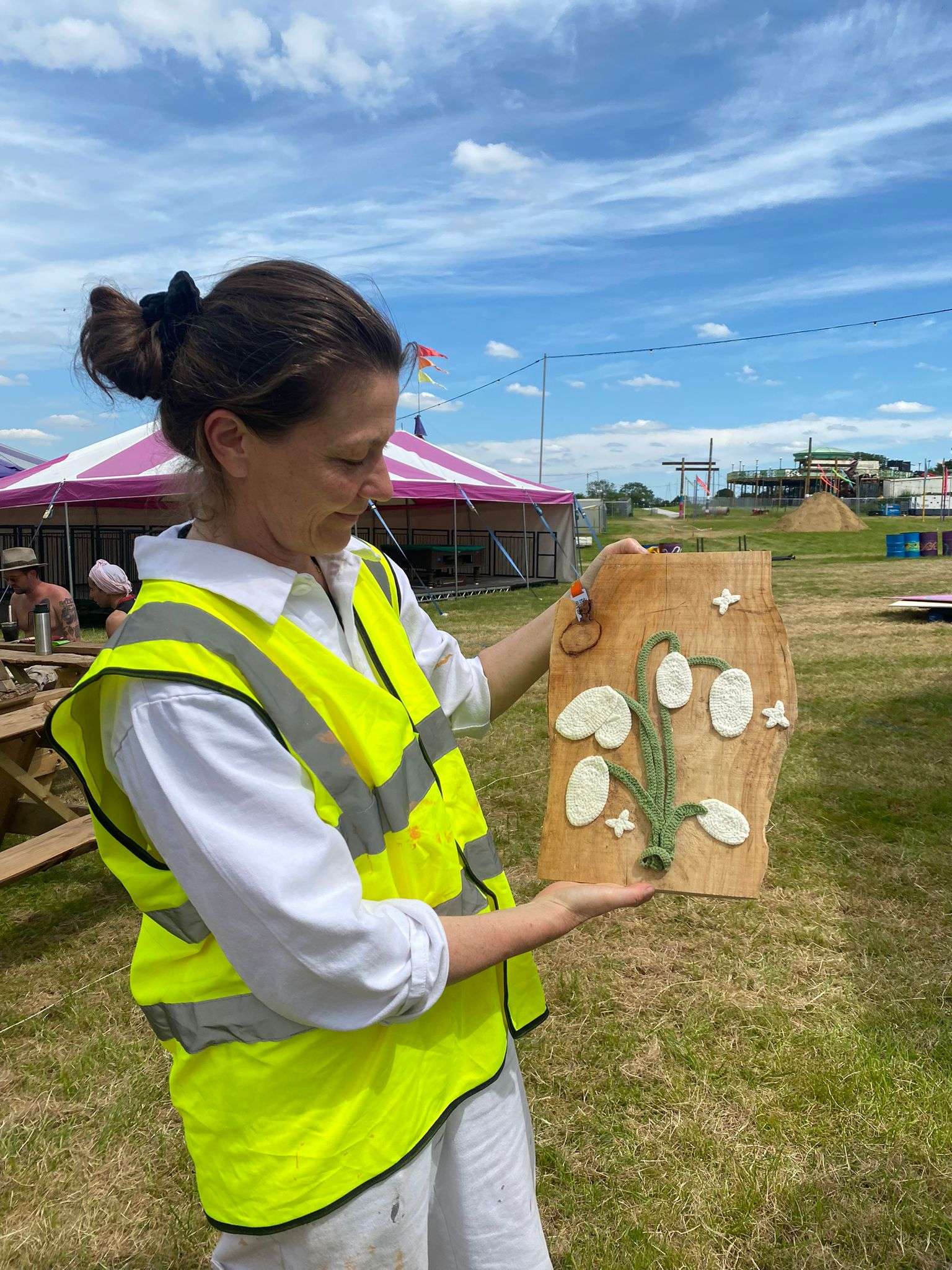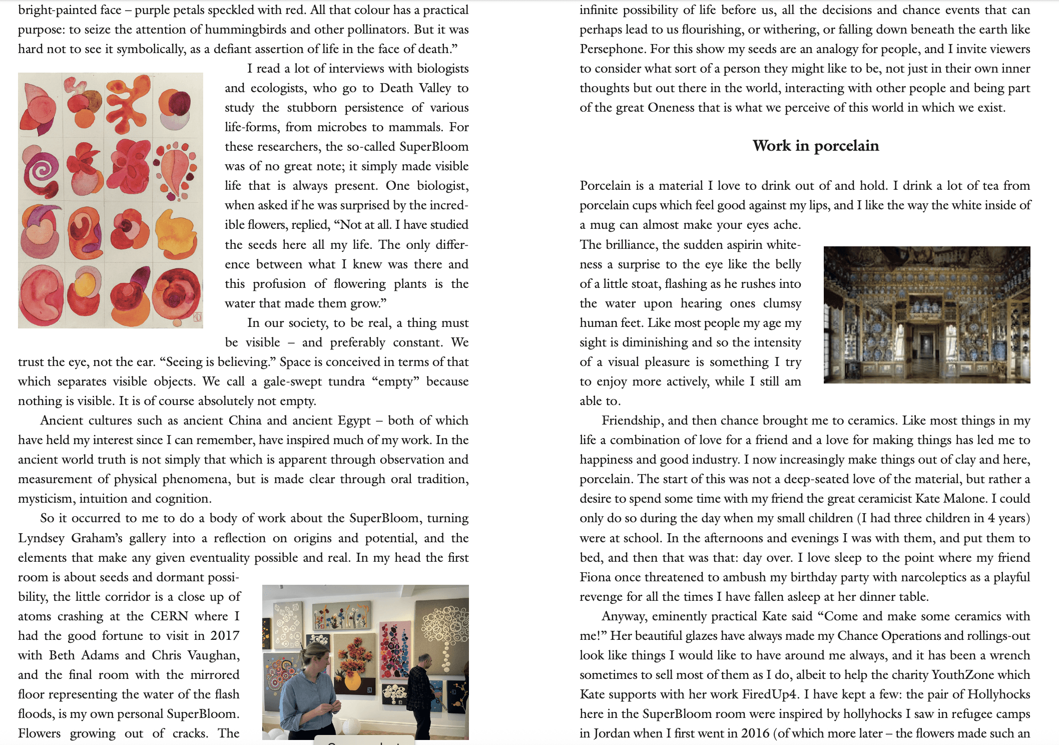 My chapbook has colour illustrations and explains the motivation for the cross disciplinary body of work Superbloom, including a film, an immersive art show with mirrored floor, a citywide series of written interventions and a mapping project. The ambitious large scale project ended up at Glastonbury Festival in a collaboration with the displaced ladies of Oshana in the Lebanon, who made crochet flowers in to a beautiful works that were installed there, plus a second mapping project with postcards printed on seed paper that could be taken home and planted. The idea is that the banners will be added to as the years carry on.
